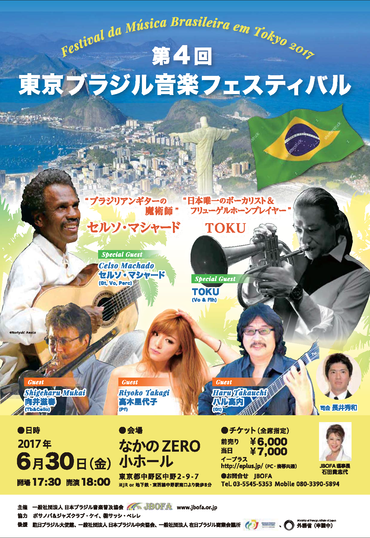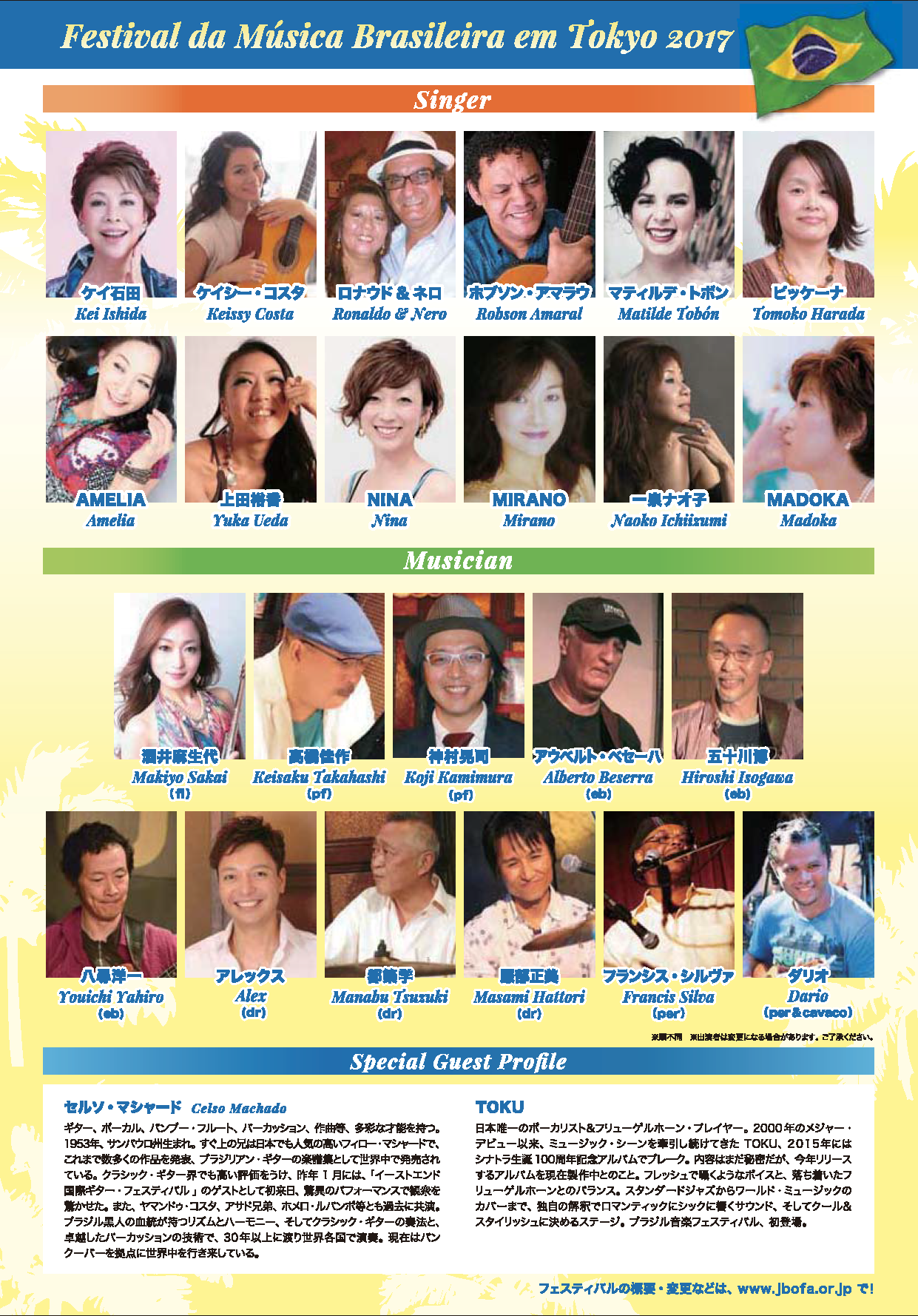Special Guestに、"ブラジリアンギターの魔術師"セルソ・マシャードと、日本唯一のボーカリスト&フリューゲルホーン・プレイヤーのTOKUを迎え、さらにトロンボーン&チェロ奏者として活躍を続ける向井滋春、ジャンルを超えた話題のピアニスト・高木里代子、日米を股にかけるジャズギター・プレイヤーのハル高内、他大勢の一流ミュージシャン、シンガーが出演するブラジル音楽のスペシャル・ナイト!